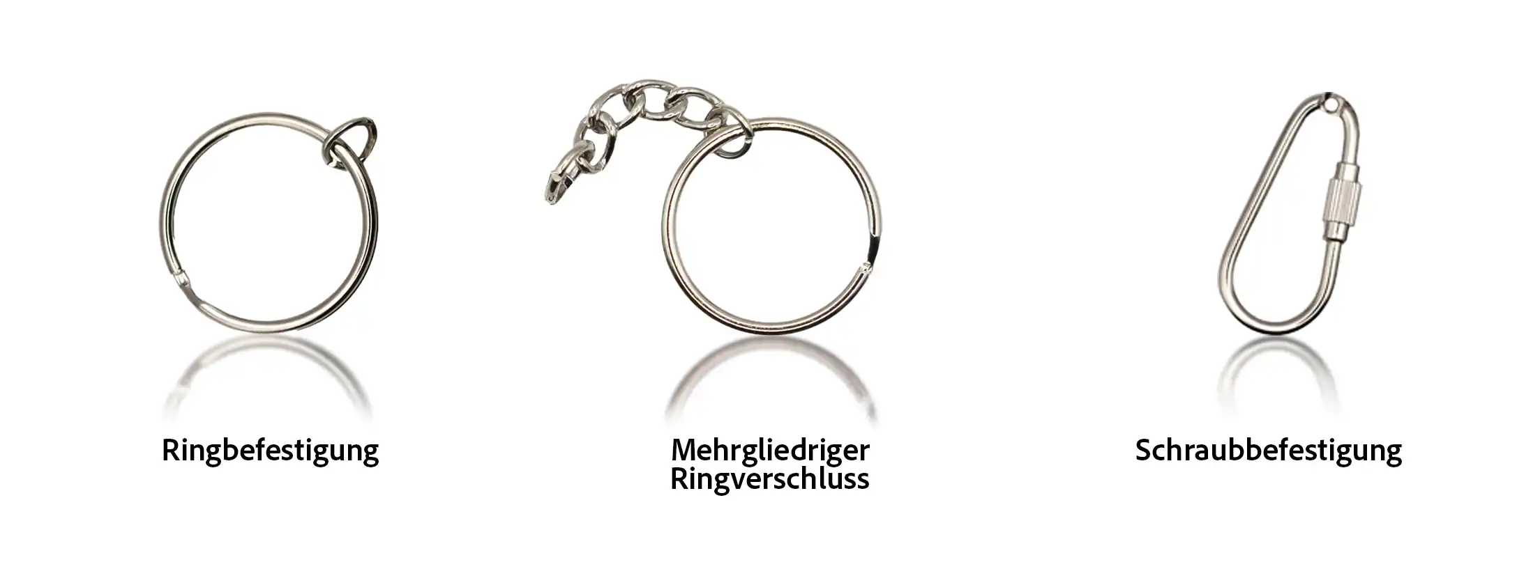 Für deine Schlüsselanhänger stehen verschiedene Befestigungsvarianten zur Auswahl. Jede hat ihre eigenen Vorteile – so kannst du je nach Einsatzzweck und Vorlieben die passende Lösung wählen.